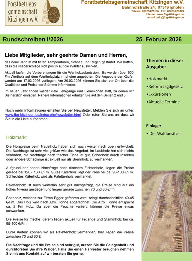 ... wir sind seit mehr als 50 Jahren Partner der Waldbesitzer im Landkreis Kitzingen in Sachen Forst. Aktuell beraten wir circa 650 Mitglieder auf einer Waldfläche von circa 13.000 ha zu den Themen Holzvermarktung, Wiederaufforstung und Förderung. Durch Bündelung von Informationen, Vermarktungsmengen und Sammelbestellungen können Synergien genutzt werden. Unsere Devise "gemeinsam handeln" steht dabei im Vordergrund. Bei Fragen stehen wir Ihnen gerne zur Seite und freuen uns auf Ihre Nachricht, Ihren Anruf oder Ihre Beitrittserklärung ebenfalls Mitglied zu werden!